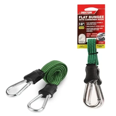 Heavy Duty Strength:Built with durable elastic and a strong flat design, this bungee cord provides excellent tension and holding power, making it ideal for securing luggage, camping gear, tools, and more. Flat Surface Advantage:The wide flat strap covers a greater area than traditional round bungees, reducing pressure points and ensuring a more secure grip on bulky or uneven items. Secure Carabiner Hook:Fitted with a heavy-duty steel carabiner clip for maximum safety and easy attachment, preventing slipping or accidental release during use in transport or storage. Comfort Grip Design:Features an injection-molded grip for comfort and control, making it easier to handle and attach, even when tension is applied in tough conditions. Multi-Purpose Use:Perfect for use at home, garage, or workshop, and ideal for outdoor activities like camping, road trips, and securing cargo in vehicles or trailers. Reliable for both professional and everyday use.