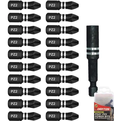 ManoManoDekton 20pc 25mm S2 Steel Impact Bits P22 With Ext Bar Specifically designed for use with impact drivers. Forged tip for greater impact resistance and a longer lifetime. Tough Impact torsion heat-treated screwdriver bits for improved durability and torsion zone for reduced breakage. Ideal for continuous high torque use withstanding changes of load due to elasticity. Includes: 20 x 25mm PZ2 Single-ended, 1 x Bit Holder. S2 grade steel construction. Ultra Strong. 1/4" Hex Fitment.