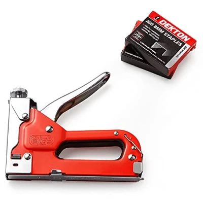 Durable Steel Construction: Built with a robust steel body, the Dekton Staple Gun ensures long-lasting durability and reliability. Its sturdy design withstands rigorous use, making it ideal for both professional and DIY tasks. Whether you're working on heavy-duty projects or light home repairs, this staple gun is engineered to handle it all. Impact Adjuster for Precision: The integrated impact adjuster allows you to control the driving force of each staple, ensuring precise and consistent results. This feature is particularly useful for working with various materials, from upholstery to softwoods, providing optimal performance and reducing the risk of damaging your work surfaces. Non-Slip Rubber Grip: Designed with user comfort in mind, the staple gun features a non-slip rubber grip handle. This ergonomic design minimizes hand fatigue and enhances control, allowing you to work for extended periods without compromising on accuracy or comfort. The grip is also cushioned to absorb impact, further enhancing usability. Handle Lock for Safety: For added security, the staple gun is equipped with a handle lock mechanism. This safety feature ensures that the staple gun remains securely closed when not in use, preventing accidental firing and potential injury. The handle lock also makes storage and transportation safer and more convenient. Built-In Staple Remover: The built-in staple remover adds to the tool's versatility, making it a valuable addition to your toolkit. Effortlessly remove staples without needing additional tools, saving time and streamlining your workflow. This feature is particularly beneficial for tasks that require frequent adjustments or corrections.