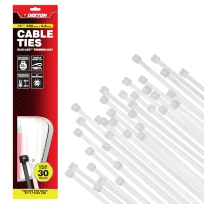 Dekton 30PC Cable Tie Set 4.8MM X 380MM White Heavy Duty Industrial Strength High Temperature Resistant Self Locking Teeth Ideal for Cables, Piping, Gardening & Wires Indoor Outdoor Use