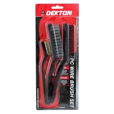Comprehensive Cleaning Solution: The Dekton 3PC Wire Brush Set includes two large wire brushes and one small detailing brush, providing a versatile range of cleaning options. Whether you're removing rust from metal surfaces or detailing upholstery, this set equips you with the right tools to get the job done efficiently and effectively. Specialized Brush Materials: This wire brush set features brushes with different coatings to meet diverse cleaning needs. The brass-coated brush is perfect for cleaning spark plugs without causing damage, ensuring optimal engine performance. The steel brush is designed to tackle tough rust and flaking paint, while the nylon brush is gentle enough for upholstery and detailing dashboards. Ergonomic Design for Comfort: Each brush in the Dekton 3PC Wire Brush Set is designed with ergonomics in mind, providing a comfortable grip for extended use. The handles are crafted to ensure a secure hold, minimizing hand fatigue during prolonged cleaning sessions. Durable Construction for Longevity: Made from high-quality materials, the brushes in this set are built to withstand heavy use and resist wear and tear. Whether you are a professional tradesperson or a DIY enthusiast, you can trust that this wire brush set will deliver consistent results for years to come. Versatile for Various Applications: The Dekton 3PC Wire Brush Set is suitable for a range of applications, making it a must-have in your decorating, garage, or workshop toolkit. This versatility allows you to tackle any cleaning project with confidence, ensuring that you have the right tool on hand for every job.