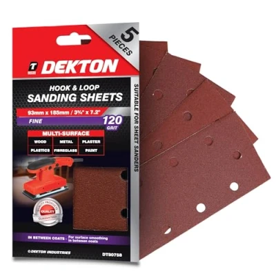 Dekton 5PC Hook and Loop Sanding Sheets 185mm/Extra Coarse 120 Grit Ideal for Sheet Sanders Multi Surface Use on Wood, Metal, Plaster, Plastics & Paint Heavy Duty Performance