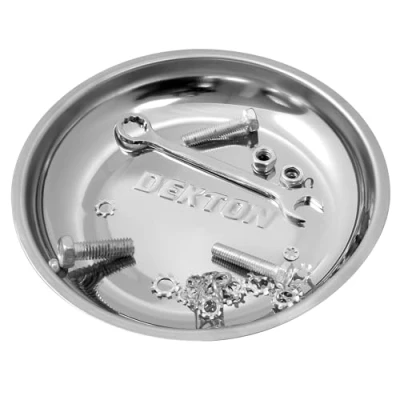 Secure Your Small Parts: The Dekton 6" Magnetic Parts Tray is designed to keep small parts, screws, bolts, and fasteners secure, preventing them from being lost or misplaced during repairs and projects. The strong magnetic base firmly holds metal objects, giving you peace of mind and easy access to your essential tools and hardware. Versatile Attachment Options: Equipped with a powerful magnet, this tray attaches to various metal surfaces, including vehicle bodywork, metal toolboxes, or machinery. It can even be used upside down, making it an essential tool for mechanics, DIYers, and hobbyists working in tight or awkward spaces. Durable and Rust-Resistant: Made from high-quality, mirror-polished stainless steel, the Dekton Magnetic Parts Tray is not only highly durable but also resistant to rust and corrosion. The sleek, polished finish adds a professional look to your workspace while providing long-lasting performance, making it ideal for use in both home garages and professional environments. Convenient Size for Any Job: With its compact 6" diameter, this magnetic tray provides just the right amount of space to hold a variety of small parts and fasteners without taking up too much room on your workbench or vehicle. Its portability and size make it easy to move around, ensuring you have your essential parts organized and within reach wherever you go. Enhance Productivity and Organization: By keeping your tools and hardware neatly contained, this magnetic parts tray allows you to stay focused on your work and avoid unnecessary downtime spent searching for lost items. Ideal for automotive work, home improvement projects, or any task involving small components, it enhances productivity and ensures a more organized workspace.