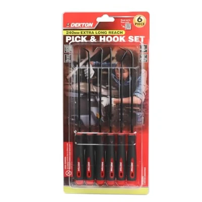 ManoManoDekton 6pc Hook And Pick Set Precision Tool O Ring Seal Removal Scraper 240mm� Extra long reach. � Ideal for retrieving lost parts and mechanical use. � Perfect for removing fuses and o-rings. � Great for separating wires. � Soft anti-slip grips. � Includes: 1pc straight hook, 1pc 45� angle, 1pc 90� angle, 3pc double angle.