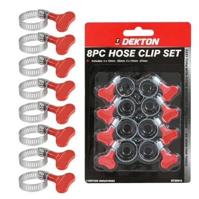 Easy Turn with Fitted Butterfly Style Screw: The Dekton 8pc Hose Clamp Set is designed for convenience with a fitted butterfly-style screw that allows for easy adjustment by hand. This user-friendly design eliminates the need for additional tools, making it simple to tighten or loosen the clamps as needed, ensuring a secure and snug fit every time. Worm Gear Type for Precise Tightening: Featuring a reliable worm gear mechanism, these hose clamps offer precise control over the tightening process. The worm gear type design allows for smooth and even pressure distribution, ensuring that the clamp holds the hose securely without causing damage or distortion to the material. No Need for Tools: With the easy-turn butterfly screw, these hose clamps can be adjusted quickly and effortlessly without the need for any tools. Whether you're in the workshop, garage, or out in the field, these clamps provide a practical solution for securing hoses, pipes, and other fittings without requiring a toolbox. Includes 4x 13mm-23mm and 4x 14mm-27mm Clamps: This 8-piece set includes two versatile sizes, with four clamps in each size: 13mm-23mm and 14mm-27mm. These sizes cover a wide range of applications, ensuring that you have the right clamp for various hose diameters, making it an essential addition to your home or professional toolkit. Durable Stainless Steel Construction: Crafted from high-quality stainless steel, these hose clamps are built to last. The durable material offers excellent resistance to rust and corrosion, even in harsh environments. The stainless steel construction ensures that the clamps maintain their strength and integrity, providing long-lasting performance., Manufacturer: Dekton