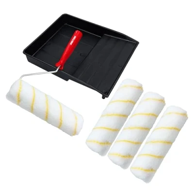 Ideal for Emulsion Paints: This 4" emulsion set is designed specifically for use with emulsion paints, making it perfect for applying paint to walls and ceilings. The set ensures smooth, even coverage with a professional finish every time without ,making any scratches on surfaces. Medium Pile Woven Fabric Sleeves: Included are medium pile woven fabric sleeves that are perfect for various general-purpose touch-up tasks. These fabric sleeves offer excellent paint pickup and release, making them ideal for achieving a consistent and high-quality finish on different surfaces. Durable Finish and Seamless Repairs: The durable material ensures that the paint goes on evenly and lasts longer, giving your surfaces a pristine look. The rollers in this set are excellent for making seamless repairs on nicks and scuffs, providing a uniform appearance that blends effortlessly with the rest of the painted surface. Complete Painting Kit: The set includes 9"roller ,Tray Multipack 4 Sleeves, offering everything you need for a complete painting job. The rollers are designed for ease of use with the included frame, and the tray makes paint application and cleanup simple and efficient. User-Friendly Design: The ergonomic roller frame ensures comfortable handling and efficient application, while the included tray makes loading paint and varnish a breeze. Designed with ease of use in mind, this set enhances your painting experience, making it ideal for both DIY enthusiasts and professionals., Manufacturer: Avron Trading Ltd