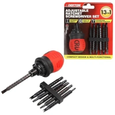ManoManoDekton 37pc Compact Stubby Ratchet Screwdriver And Bit Set Adjustable Tool� Flexible Handle: The screwdriver handle is short and flexible, provides a safe and stable grip, comfortable to the touch, more labour saving. � Contains 6 pieces double head bits of slotted and cross, meet your different using needs. � Easy Adjustment: 3 stage ratchet adjustment, more stable reinforcing sleeve. Press the expansion buckle to adjust the length.