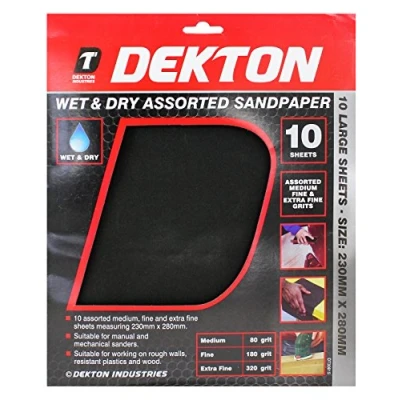 Dekton Wet & Dry Assorted Sandpaper 10 Medium, Fine And Extra Sheets Measuring 230 x 280mm Suitable For Manual, Mechanical Sanders Working On Rough Walls, Plastics, Wood