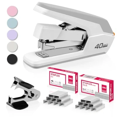 Deli Effortless Desktop Stapler, Heavy Duty 40 50 Sheet Capacity, One Finger, No Effort, Includes Staples & Staple Remover, White