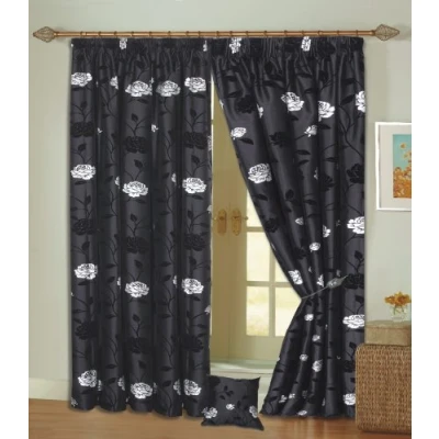A pair of high quality raised flock curtains black & silver rose detail 2 panels in a pack each curtain 46" wide by 54" long Total curtaining width 92" Please allow approx twice your window width in curtain material Machine washable at 30 degrees.