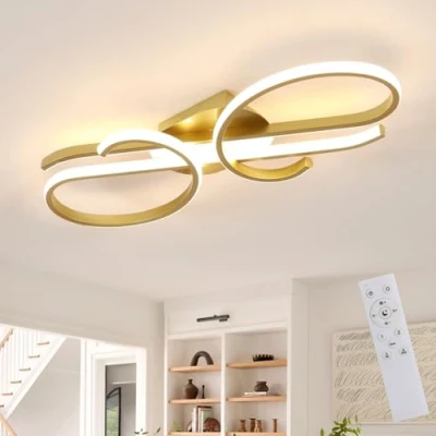 Dimmable ceiling light specifications: L 55 * W 20 * H 7 cm, Power: 29W, Color temperature: 3000K-6500K, Operating voltage: 220V-240V. color: gold. Material: aluminum + acrylic. Average lifespan: 50000 hours, lighting area: 10-25 square meters Durable material: The main body of the ceiling lamp is forged from high-quality metal, and the surface is galvanized to create a luxurious and elegant visual effect, exquisite workmanship, anti-corrosion and anti-rust, durable. The acrylic lampshade transmits light well, the light is soft and even, protect your eyes Fully Dimmable: The brightness of the ceiling light fixtures can be infinitely adjusted (10% - 100%) with the remote control, and the color temperature can be adjusted from cool white to warm white (6500K-3000K). When the ceiling light is turned on using the remote control, it remembers the last lighting setting. The wall switch does not have a memory function Night light and timer function: For convenience, there is a night light button on the remote control. In addition, you can use the timer function to help you sleep soundly, with the light automatically turning off after 30 or 60 minutes Versatile: The gold ceiling light adopts a unique and creative arc design with interlocking lines, creating a delicate and romantic effect. Suitable for kitchen, living room, bedroom, dining room, office, hotel and other places