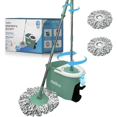 delka Spin Mop and Bucket Set Easy Foot Pedal Water Removal, 360 Swivel Motion, Includes 2 Microfibre Heads, All Surface Cleaning, Splash Guard for Clean Mopping (Spin Green white)