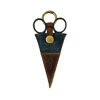 Scissor pocket is made of canvas and leather Case protects your scissors Scissors are held in place by a leather flap with a brass press fastener Flap has a lockable brass ring Attach the scissor pocket to or in a (project) bag