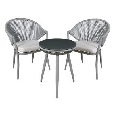 The set features a modern and stylish aesthetic, thanks to its combination of materials. The chairs are constructed with a sturdy powder-coated aluminium frame that ensures durability and rust resistance. Complementing this is the 8mm round weatherproof Textilene rope, which adds visual interest and comfort. The aluminium tripod table is paired with a 5mm shatterproof tempered glass top, providing a sleek surface that is both practical and attractive. This combination not only enhances the contemporary look but also makes it highly suitable for outdoor use.