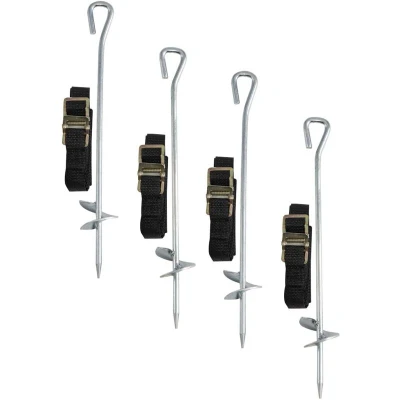 General description Designed for stability and safety, the Dellonda Heavy Duty Trampoline Anchor Kit includes four spiral steel pegs and four adjustable safety straps. This kit is suitable for use with trampolines of various sizes, including 6ft, 8ft, 10ft, 12ft, and 14ft, ensuring that your trampoline remains securely anchored even during strong winds. Technical specifications Includes: 4 spiral steel pegs Includes: 4 adjustable safety straps Compatible with trampolines: 6ft, 8ft, 10ft, 12ft, and 14ft Usage Utilize the spiral shape of the pegs for secure footing, while the round mounts facilitate ideal strap guiding to keep your trampoline stable during use.
