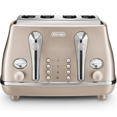 JoybuyThe De'Longhi Icona Metallics 4 Slice Toaster (CTOT4003.BG) features a stylish beige metallic finish, extra-wide slots, variable browning control, and practical functions like reheat, defrost, and removable crumb trays, combining Italian elegance with versatile, family-friendly toasting performance for any kitchen.