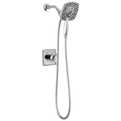 Diverter lever sets In2ition Two-in-One Shower to one of three options: Showerhead and Handshower, Showerhead only, and Handshower only Pressure balance valve keeps water temperature within a safe ±3° F (±1.6° C), helping to protect you from sudden changes in hot or cold water pressure Pause feature reduces the water to a trickle, allowing you to conserve water while doing tasks such as lathering up or shaving your legs Soft, rubber spray holes allow you to easily wipe away calcium and lime build-up from the spray face of your showerhead and handshower with the touch of a finger.Faucet and finish lifetime limited warranty Flow rate:2.00 gpm @ 80 psi, 7.6 L/min @ 550 kPa, Weight: 4.6 pounds, Manufacturer: Delta Faucet