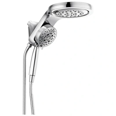 HAND SHOWER AND SHOWER HEAD IN ONE: The 2-in-1 Dual Shower allows you to use the hand shower with hose separately or securely docked for a luxurious and versitile showering experience 3X COVERAGE: Delta H2Okinetic PowerDrench Spray provides 3X more coverage than a standard shower head by creating a unique wave pattern and larger water droplets for more intensity and warmth 5 POWERFUL SPRAY SETTINGS: Choose between H2OKinetic PowerDrench spray, full body spray, massaging spray, shampoo rinsing spray, and pause EASY TO CLEAN: With Touch-Clean spray holes allow you to quickly and easily wipe away calcium and lime build-up with a touch of a finger, so no need to soak or use chemical cleaners LIFETIME LIMITED WARRANTY: You can buy with confidence, knowing that Delta shower heads are backed by Delta's Lifetime Limited Warranty, Weight: 0.59 pounds, Manufacturer: Delta Faucet Company