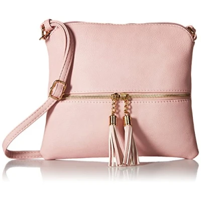 10" (W) x 9" (H) x 0.5" (D) Zipper closure & front zipper is a functional pocket Adjustable shoulder strap with 25.5" drop Faux leather & gold tone hardware 1 zipper pocket & 1 slip pocket inside