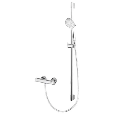 The set consists of a wall bar, thermostatic mixer, a slider, a hand shower and a shower hose. The 3-jet shower head sits comfortably in your hand thanks to the round handpiece and its low weight. The shower head can be individually adjusted to the body size thanks to the slider and can be changed quickly and easily thanks to the rotating clamp attachment. Thanks to the practical anti-limescale knobs, the shower head is quick and easy to clean even with limescale water. Thanks to the clever rotating cone on the hose, unwanted twisting of the hose is not possible., Manufacturer: Delvac