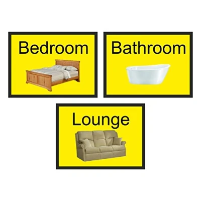 Dementia Sign Multi-Pack 300mm x 200mm Material 1mm High Gloss Rigid Plastic Allows Flush Fittings To Walls Manufactured By UK Safety Store With A 5 Year Warranty Screen Printed Direct To The Material For A Better Finish Consists of: 1 x Bathroom Dementia Sign (300mm x 200mm), 1 x Lounge Dementia Sign (300mm x 200mm), 1 x Bedroom Dementia Sign (300mm x 200mm), Manufacturer: UK Safety Store