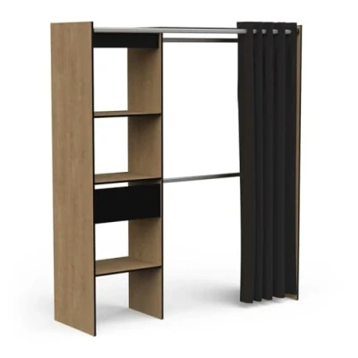 Incredibile kit armadio estensibile in stile industriale, che ti rende la vita più facile per organizzare tutti i tuoi vestiti, con 2 barre per appendere giacche e abiti, e con una colonna composta da 3 ripiani e un cassetto, per piegare i tuoi vestiti e tenerli organizzati. Questo kit per armadio è realizzato in melamina di alta qualità in colore rovere spazzolato e nero opaco, coperto da una tenda nera in poliestere, per non far apparire i vestiti alla vista. Dimensioni: altezza 187 cm, larghezza 168'20 cm, profondità 50 cm. Si tratta di un mobile con kit di montaggio, che include manuale di istruzioni e viteria. Non sono garantite spedizioni a Menorca, Ibiza e Formentera.