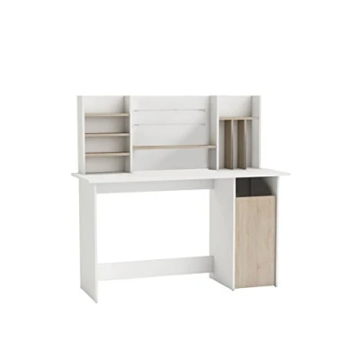 Scrivania realizzata in materiale resistente Colore del prodotto: bianco e rovere spazzolato Prodotto compatto e pratico Prodotto di qualità Desk, 18 mm top. 1 door, 1 shelf adjustable on 3 levels 2 elastics at centre of top unit to hold papers/photos Oak and white finish self-assembly