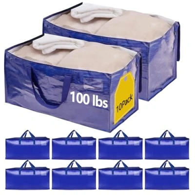 Demiwise 10 Pack Heavy Duty Moving Bags with Strong Zippers and Reinforced Handles, Extra Large Storage Totes for Packing & Storing, Alternative to Boxes Space Saving 95L,Blue