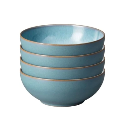 SET OF 4 CEREAL BOWLS: This set contains four blue and white 820ml (17cm x 17cm x 6.5cm) cereal bowls with a reative glaze effect. These bowls are perfect for enjoying porridge, soup, desserts and puddings! This bowl set is also great for individual pies and desserts, served straight from the oven to the table. HANDCRAFTED IN ENGLAND: handcrafted in the Denby Pottery in England from locally-sourced, high quality clay - Each item is touched by at least 20 pairs of hands during the making process in our 200 year old factory in Derbyshire DURABLE & VERSATILE STONEWARE: This cereal bowl set has been expertly glazed to prevent chipping and enhance durability. Our ranges are versatile and multi-functional - perfect for everyday use or for special occasions - so a smaller number of pieces are needed. OVEN, MICROWAVE, DISHWASHER & FREEZER SAFE: This cereal bowl set can be safely used in the oven, dishwasher, freezer and microwave making it perfect for everyday use! UNIQUE GLAZE: This Azure Haze cereal bowl set features a unique reaction of the azure blue and crisp white glazes to create stunning aqua tones.