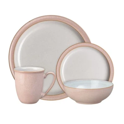 Denby Elements Sorbet Pink Dinner Set For 1 4 Piece Ceramic Tableware Dishwasher Microwave Safe Crockery Single Place Setting x Plate, Small Cereal Bowl, Coffee Mug