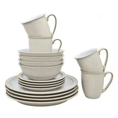 This 16 piece Denby Linen Tableware Set includes 4 x Small Mugs, 4 x Cereal Bowls, 4 x Small Plates and 4 x Dinner Plates all styled in the simple and soothing oatmeal tones of the Linen design.Made in England and featuring a hardwearing glaze suitable for everyday use, this Denby Linen Tableware Set is ideal for serving breakfast, lunch and dinner.The set is dishwasher safe and would make a great gift or addition to an existing Linen collection.Denby 10 year guarantee.