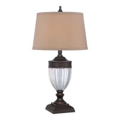 A chic table lamp made up of a glass and metal base finished in Palladian Bronze, topped with a tan hardback fabric shade with double trim.