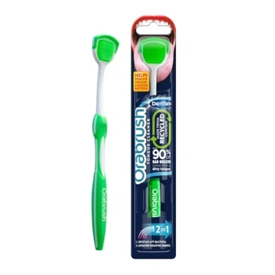 DENTEK ORABRUSH HELPS REMOVE ODOUR-CAUSING BACTERIA and leaves your mouth feeling fresher ULTRA SOFT BRISTLES that reach deep into the uneven crevices of the tongue to loosen bacteria BUILT IN SCRAPER that collects and removes the bacteria and residue generated from the brushing LONG HANDLE and FLAT DESIGN helps reduce gagging and allows for an easier and more effective cleaning experience MADE OF 92% RECYCLED CONTENT & RECYCLABLE PACKAGING