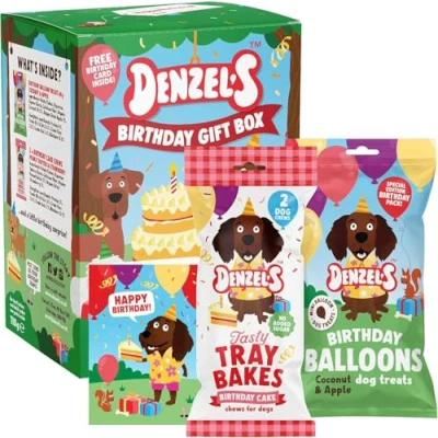 DOG BIRTHDAY TREATS - This mini gift box includes one pack of birthday cake flavour dog chews with yummy peanut butter & strawberry plus a pack of birthday balloon shaped dog treats with delicious Coconut & Apple. Woof! FREE BIRTHDAY CARD FOR YOUR DOG INCLUDED - Every gift box even includes a dog birthday card. All sorted! PERFECT DOG BIRTHDAY PRESENT - Simply scan the gift box for more party ideas and a 'make your own dog birthday hat kit'! Best birthday ever! 100% NATURAL GRAIN FREE TREATS - Nothing artificial, no grain or gluten, no cheap fillers or nasties. Just real healthy ingredients used for our low cal natural dog treats and dog chews. DISCOVER THE RANGE - from soft baked chews to tasty training treats. We've got snack time covered!