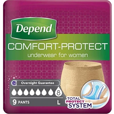Depend comfort protect pants for women keep you feeling secure and confident both day and night with a soft, comfortable, discreet fit Depend total protect system has been specifically tailored with the combination of fast-absorption channels and odour-eliminating filters Depend incontinence pants for women provide worry-free protection from leaks and odours Specially made to fit the shape of a woman with a pant-like waistband, oval-cut leg openings and fit-flex protection with lycra strands to ensure a smooth fit Magnificiant absorbency, disposable pants have an overnight guarantee and come in a neutral beige colour