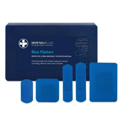 Visually Detectable Design: The plasters come in a bright blue color, making them easily noticeable if they ever come into contact with food, ensuring safety in food preparation areas Metal-Detectable Feature: Each plaster includes an aluminium strip behind the dressing pad, which is detectable by metal detectors, adding an extra layer of safety in food processing environments Modern Washproof Features: Incorporating all the advanced characteristics of Dependaplast Washproof Plasters, these are designed to be durable, washproof, and comfortable for prolonged wear Safe and Hygienic Packaging: The box contains 120 sterile, individually wrapped blue plasters, pack with assorted plasters Safety Warning Included: Comes with a clear safety warning to keep out of the reach of children, making it a responsible choice for both professional and personal kitchen environments