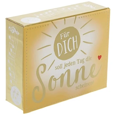 Small cardboard box (approx. 11.2 x 9.5 x 3.5 cm) as a gift for a birthday or for many other occasions. Open the gift box, the song "Here comes the Sun" will sound On the lid there is a golden motif with a sun and the inscription "F黵 dich soll jeden Tag die Sonne scheinen" The inside is in sunny yellow and the saying "Du bist ein sehr spezer Mensch!" Designed International products have separate terms, are sold from abroad and may differ from local products, including fit, age ratings, and language of product, labeling or instructions., Manufacturer: Depesche