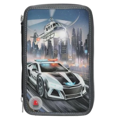 Depesche 13333 Monster Cars Filled 3 Compartment Pencil Case in Grey, with LED Effect and Police Motif, Coloured Pencils, Scissors, Ruler Much More