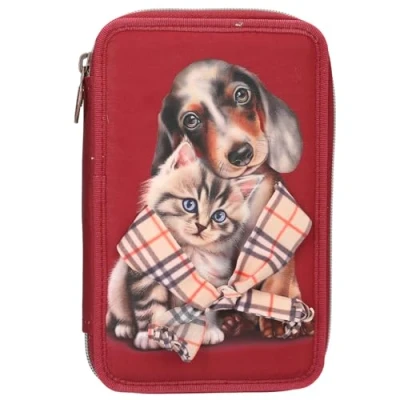 Depesche 13674 TOPModel Fur Ever Friends Filled 2 Compartment Pencil Case in Dark Red with Dog and Cat Motif, Colouring Pencils, Scissors, Ruler Much More