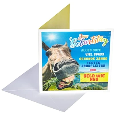Hinged card with 3D effect on the front Printed with birthday wishes Inner part of the folding card without text, so plenty of space for personal words, messages and messages for the birthday child The high-quality double card is made of sturdy paper and comes with a matching coloured envelope Size of the card approx. 17 x 17 cm. Weight: approx. 42 g