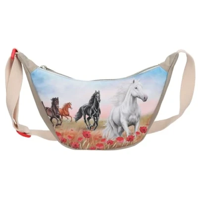 Practical crossbody bag for girls Design: Miss Melody Poppy Sand by Depesche - In Beige, with horse motif, poppy meadow and red buckle details The bum bag has a main compartment, which has enough space for mobile phone, keys, wallet and much more. offers The carrying strap is adjustable in length and ensures comfortable carrying as a bum bag or crossbody Dimensions: approx. 30 x 18 x 5 cm