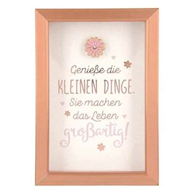 Bronze coloured wooden frame in the format approx. 8.4 x 5.8 x 1.9 cm With a pretty designed saying: enjoy the little things. They make life great The picture frame can be placed or hung to decorate tables, shelves and walls The image inside is interchangeable and can be replaced with a personal photo for example Ideal as a gift for many occasions such as birthday, anniversary, Mother's Day, Father's Day, wedding anniversary, Easter or Christmas