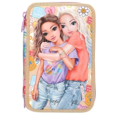 Pencil case for girls at school, nursery and leisure Design: TOPModel Girl Power by Depesche – in beige, with model motif and many colourful batch prints Equipped with 18 coloured and felt tip pens, 2 pencils, double sharpener, eraser, ruler, scissors, glue stick and a Velcro pouch Cool extra: the colourful zippers Dimensions: approx. 20 x 13 x 7.5 cm