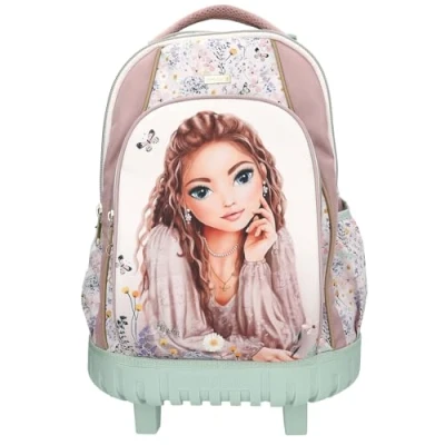Backpack for girls at school, leisure, travel and everyday life Design: TOPModel Summer Feeling by Depesche - in pink and sage green, with a model motif and many colourful patches Equipped with 3 spacious compartments and 2 side pockets for umbrella and water bottle Features 2 smooth-running wheels, a telescopic handle for easy transport, padded straps and back, a back flap and a water resistant base Size: 52 x 34 x 25 cm. Weight: approx. 2000 g