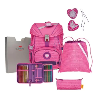 LIGHTWEIGHT: Many features – low weight. The school backpack offers enough space for all important school utensils. The practical side pockets and spacious inner compartments make organisation in the satchel a breeze. Safety: On the front, shoulder straps and sides, the backpack is equipped with retro-reflective material. When light from car headlights hits these surfaces, they radiate back and make the backpack light brightly. Ergonomics: The ergonomically shaped back padding ensures a lightweight feel. So that the backpack always fits, it can be adjusted to the child's back during the entire school time using the multi-height-adjustable carrying strap system. Interchangeable buttons: with the interchangeable buttons, any DerDieDas school bag and backpack can be redesigned in no time at all according to your own preferences. Every day, the backpack becomes a personal unique item. Complete set: for the ideal school equipment, DerDieDas always has the whole set: school backpack including 2 interchangeable buttons + 1 pendant, pencil case filled with Staedtler quality coloured pencils, pencil case, sports bag and notebook box.