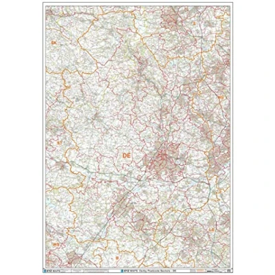 A High Quality Postcode Sector Wall Map. Showing the Entire DE Postcode Area, with Precise Boundaries and Clear Postcode Labels on a Detailed Map Background. A0 Size - 1189mm x 841mm Art quality 120 gsm paper