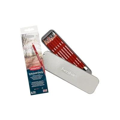 Derwent Drawing Coloured Pencils in a Tin: Set of 6 premium quality, earthy tones, resistant to prolonged colour change, for professional artists and hobbyists Nature's Palette: These thick core pencils are perfect for capturing a variety of subjects, from wildlife and landscapes to portraiture Professional Quality Artist's Pencils: Achieve a smooth colour application for an opaque finish with excellent blending and layering capabilities, to create texture and depth Best Used With: Derwent Twin Hole Sharpener, USB Rechargeable Eraser, Sketching Paper and Burnisher and Blender Pencils Contents: 1 x set of 6 Derwent Drawing colour pencils in a metal storage tin, creamy premium quality, 5mm round core, nature-inspired colours (0701089)