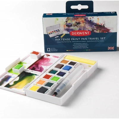 Inktense Permanent Paint Set #1: Set of 12 high quality professional grade artist’s paints in rich, vibrant colours for creating dramatic, ink-like effects; ideal for portraits, landscapes and more Doesn’t washout like watercolour due to the permanency in the paint formulation. Layer up intense vibrant colours Advanced performance with specially formulated active colour technology; Richly coloured pigments intensify when activated with water; Light washes dry permanently Perfect For Artists: Also experiment with quilting, crafting, fashion design, card making and colouring-in; soft core, with firm texture; best used with Derwent waterbrushes and Inktense paper Contents: 1 x Derwent Inktense Paint Pan Set #1, includes 12 highly light-fast paint pans, a mini waterbrush, sponge and 5 well mixing palette