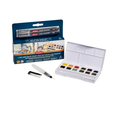 Derwent Line and Wash Mixed Media Paint Set, Set of 14, Half Pan Size, Fine liner Pens, Water Soluble Paint, Ideal for Urban Sketching Paintings, Professional Quality, Travel 2306245