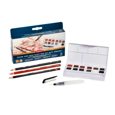 Derwent Shade and Tone Mixed Media Paint Set is a curated mixed media collection of paints and pencils The set includes 3 Derwent pencil ranges and 12 paints in 4 popular formulations, all in natural colours for landscape, portraits and tonal studies This travel paint set is a great starter set for those who are confident with pencils and want to progress to paint for skin tone studies For best results, pair with: Derwent Inktense Paper (cold press textured paper), Battery Operated Eraser, Push Button Waterbrushes, Spritzer and Artpack Contents: 1 x Shade and Tone Paint Pan Set, includes 12 colours in Black, White, Storm Grey, Graphite Grey, Sepia Ink, Burnt Earth, Burnt Embers and more, 3 x Sketching and Drawing Pencils